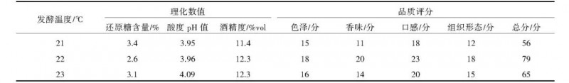 由表3可知,發酵溫度為21℃時,桑甚果酒的還原糖含量高于其他溫度,酒精度低,說明該溫度下酵母活性較弱,把還原糖轉化成酒精的能力不如22℃和23℃,且桑甚果酒散發的味道比較淡,口感不好。發酵溫度為22℃時,香味較濃,口感豐富,感官評分最高。發酵溫度為23℃時,桑甚果酒香味較淡,口感稍遜于22℃。綜上,發酵溫度為22℃時桑甚果酒的品質最好。
