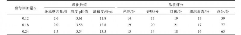 由表5可知,酵母添加量也是影響桑甚果酒品質的主要因素。酵母在發酵瓶中主要進行無氧呼吸,將糖轉化為酒精。隨著酵母添加量的增加,桑甚果酒的還原糖含量不斷下降,酒精度隨之上升。當酵母添加量為0.18 g時,桑甚果酒的色澤最好、香味最濃、口感最好,綜合評分最高。綜上,酵母添加量為0.18 g時桑甚果酒的品質最好。