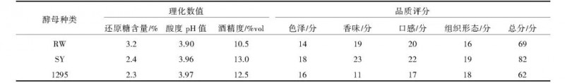 由表6可知,酵母種類也是影響桑甚果酒品質的主要因素。添加RW酵母的桑甚果酒還原糖含量最高,口感偏甜,香氣柔和,但酒味很淡;SY酵母的甜度適宜,有桑甚的特有香氣,醇香濃郁,酒體厚實,味道突出;1295釀酒酵母發酵的果酒雖然酒味濃郁,但出酒率不高。綜上,SY酵母更適合用來發酵桑甚果酒。