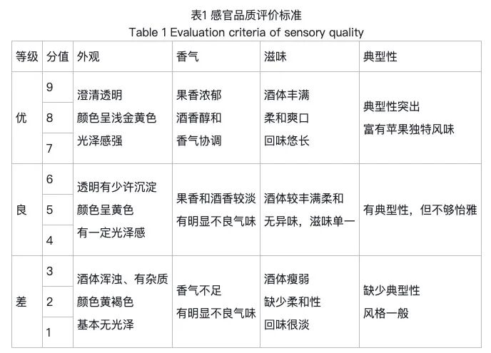 參考袁倩等方法,建立模型進(jìn)行分析。依照本研究評(píng)定因素(外觀、香氣、滋味及典型性)建立評(píng)價(jià)因素集U,表示為U={U1,U2,U3,U4}。按優(yōu)、良、差3個(gè)等級(jí)進(jìn)行評(píng)定,得到評(píng)定等級(jí)集,V={V1,V2,V3}={優(yōu),良,差},評(píng)價(jià)等級(jí)W={W1,W2,W3}={8, 5, 2}。并通過(guò)調(diào)查10名食品專業(yè)的學(xué)生(5名男生,5名女生,均無(wú)任何身體缺陷),對(duì)4個(gè)評(píng)價(jià)指標(biāo)進(jìn)行權(quán)重分析,并取平均值,而得到權(quán)重集K={0.220, 0.283, 0.255, 0.242}。感官評(píng)定小組(5名男性和5名女性)參照YANG等方法,以表1所示蘋果酒感官質(zhì)量評(píng)定標(biāo)準(zhǔn)進(jìn)行感官評(píng)價(jià)。統(tǒng)計(jì)各等級(jí)的票數(shù),然后將各等級(jí)票數(shù)分別除以總票數(shù)即得到模糊關(guān)系矩陣A,進(jìn)而得到第i個(gè)樣品的評(píng)價(jià)結(jié)果Yi=K×Ai,該樣品的綜合評(píng)價(jià)矩陣Bi=Yi×W。