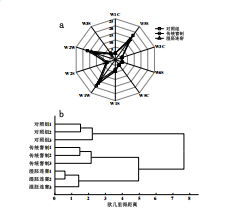 圖3-a顯示了不同窨制工藝咖啡樣品對電子鼻傳感器響應(yīng)的雷達(dá)圖,3組咖啡樣品對W5S、W1W和W2W傳感器的響應(yīng)值較大,這3種傳感器分別對氮氧化合物、有機(jī)硫化物和無機(jī)硫化物反應(yīng)靈敏,其中2種窨制方式茉莉咖啡與對照組在W5S、W1W和W2W,傳感器響應(yīng)值差異明顯,表明這3個傳感器對咖啡揮發(fā)性氣味區(qū)分效果較好。如圖3-b所示,聚類分析將處理組、窨制組有效分為兩大類,表明咖啡豆經(jīng)茉莉花窨制后香氣與對照組明顯不同。此外,聚類分析又將傳統(tǒng)窨制與濕坯連窨更詳細(xì)地分為兩小類,表明窨制工藝不同也會造成風(fēng)味上的差異,這一結(jié)果與茉莉咖啡的感官評價呼應(yīng)。